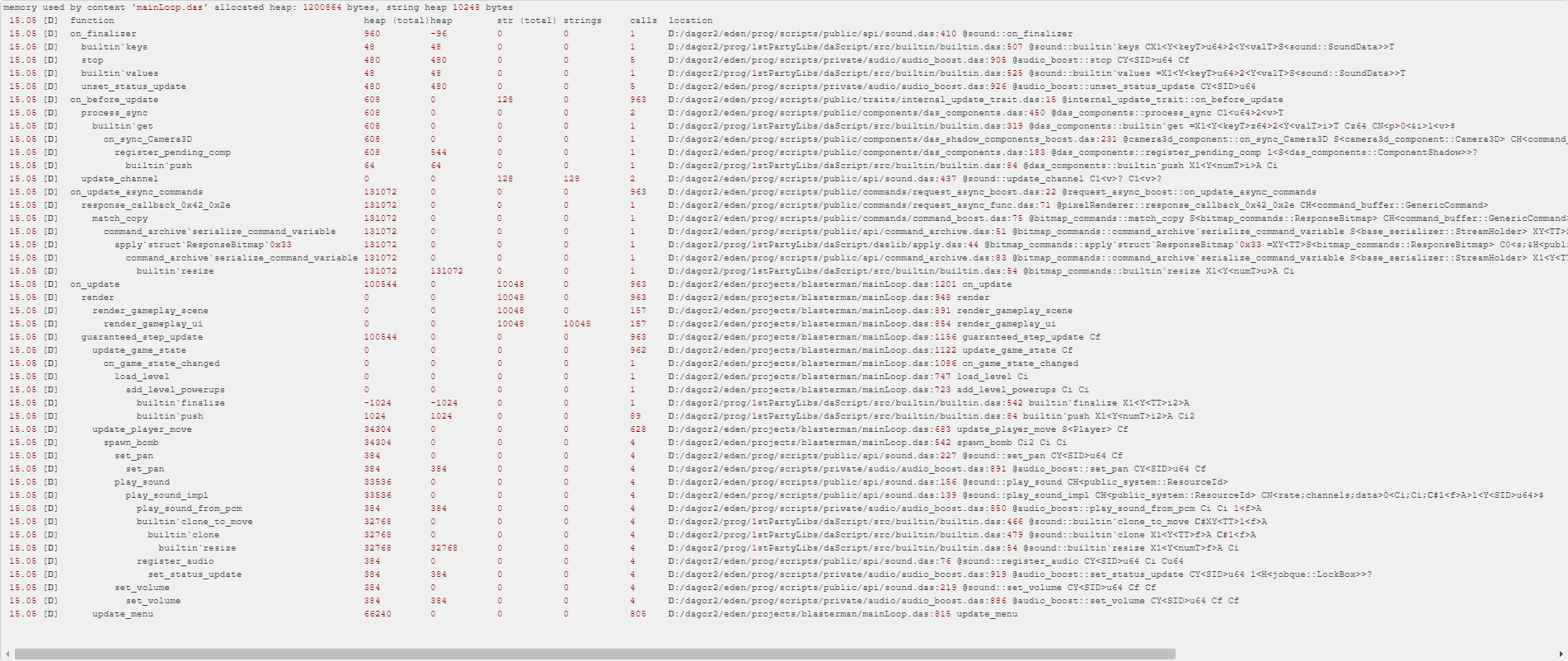 Open the log file in the game folder and find the line with memory used by context text. This line contains information about the total heap allocated by the script and the string heap allocated by the script. After that you can find the table with detailed information about a heap allocated by each function.