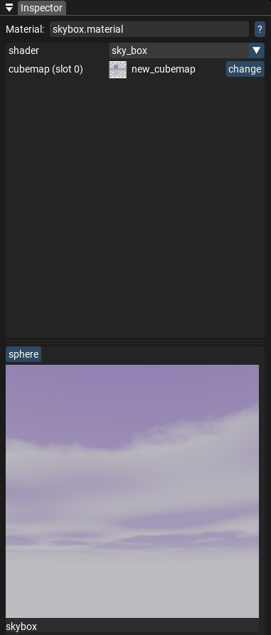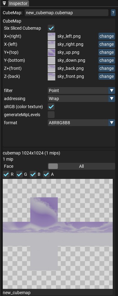 Set up a texture for each side of the cubemap. Changes will be applied immediately, and you can see them in the preview.